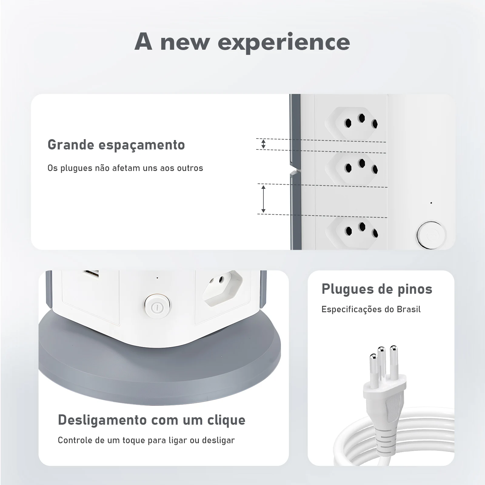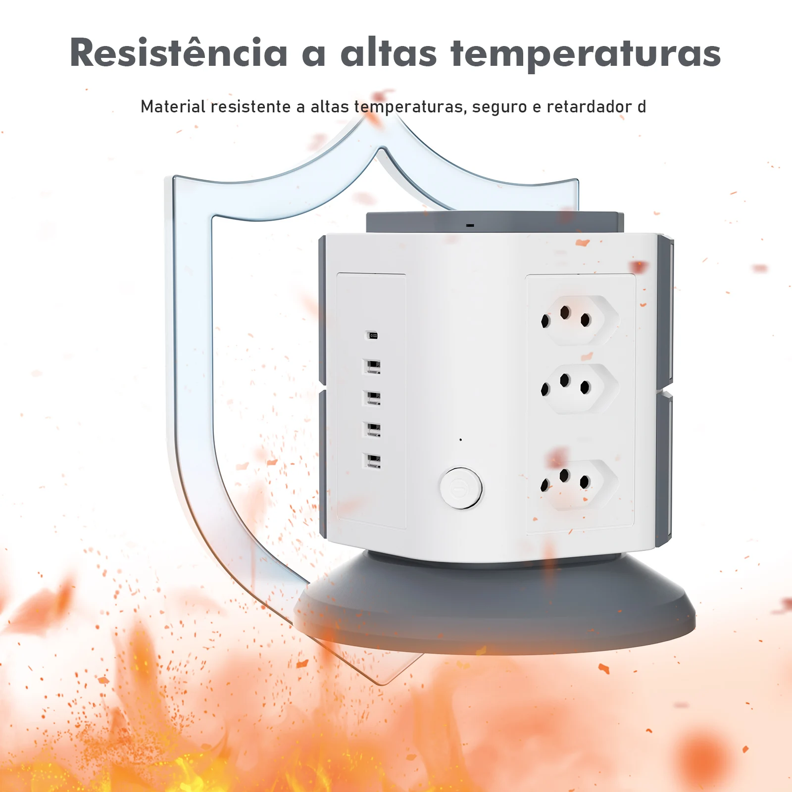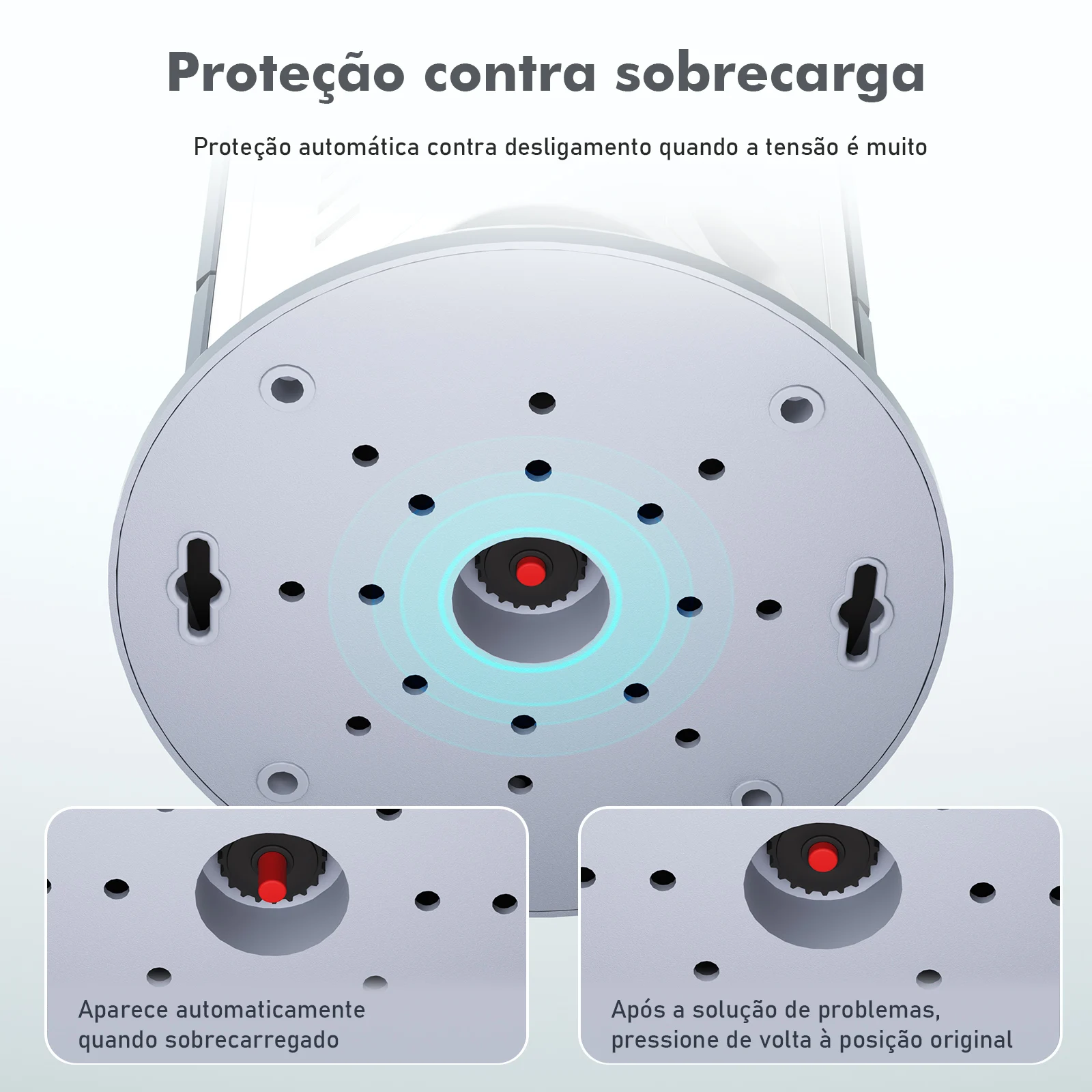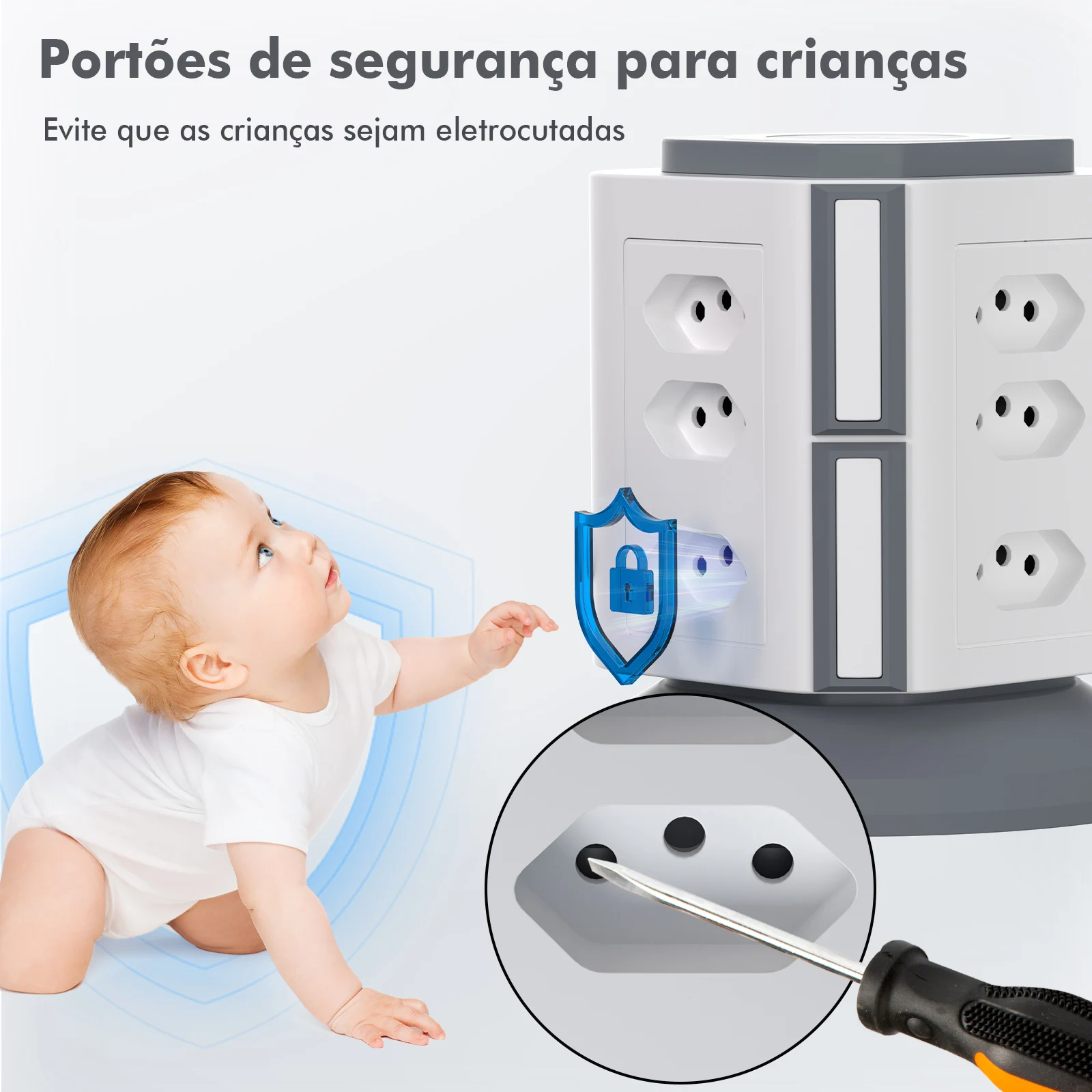 Proteção Familiar: Shutters de segurança infantil nas tomadas e desligamento automático em caso de sobrecarga.