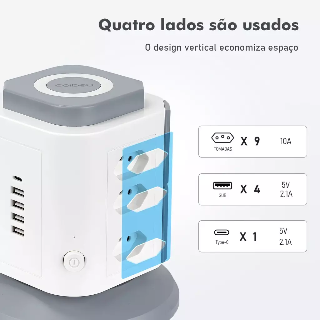 Carregamento Rápido: Portas USB e Type-C com saída total 5V/2.1A, ideal para celulares, tablets e notebooks.